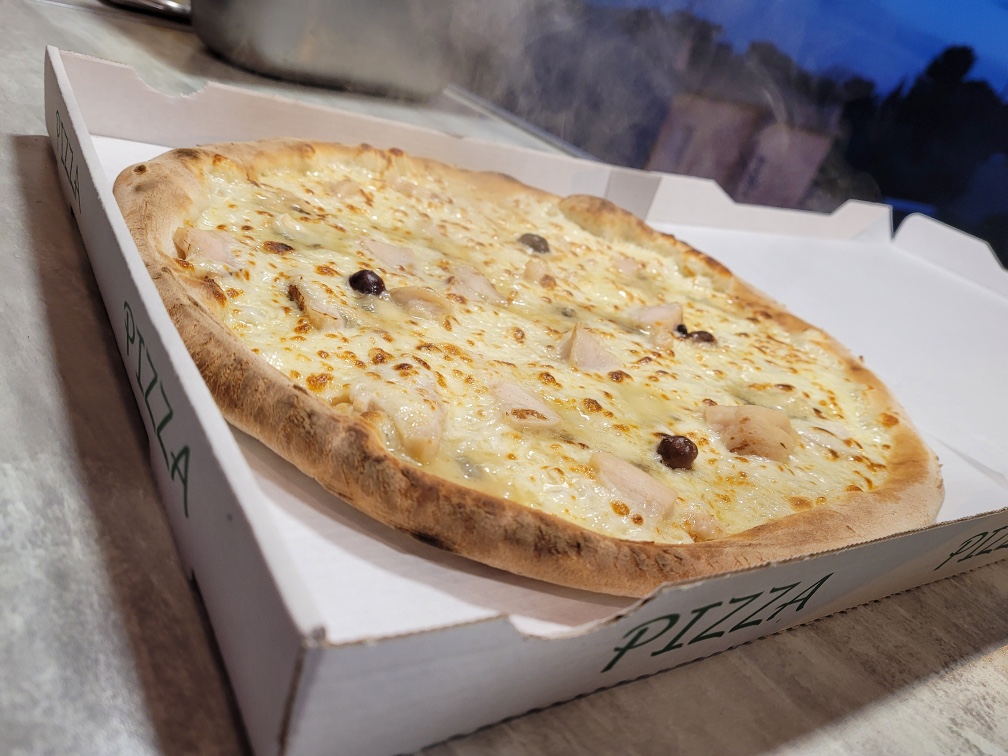 Crème fraîche, mozzarella, moutarde à l’ancienne, poulet, oignons, champignons, olives, origan