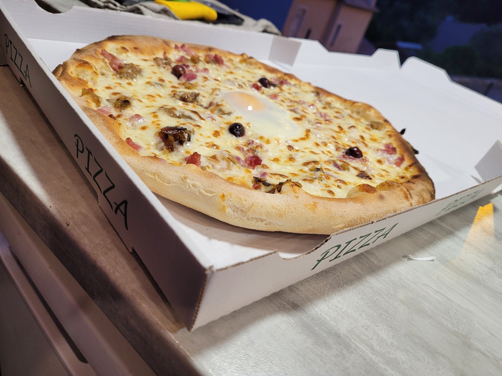 Crème fraîche, mozzarella, lardons, oignons, oeufs, olives, origan