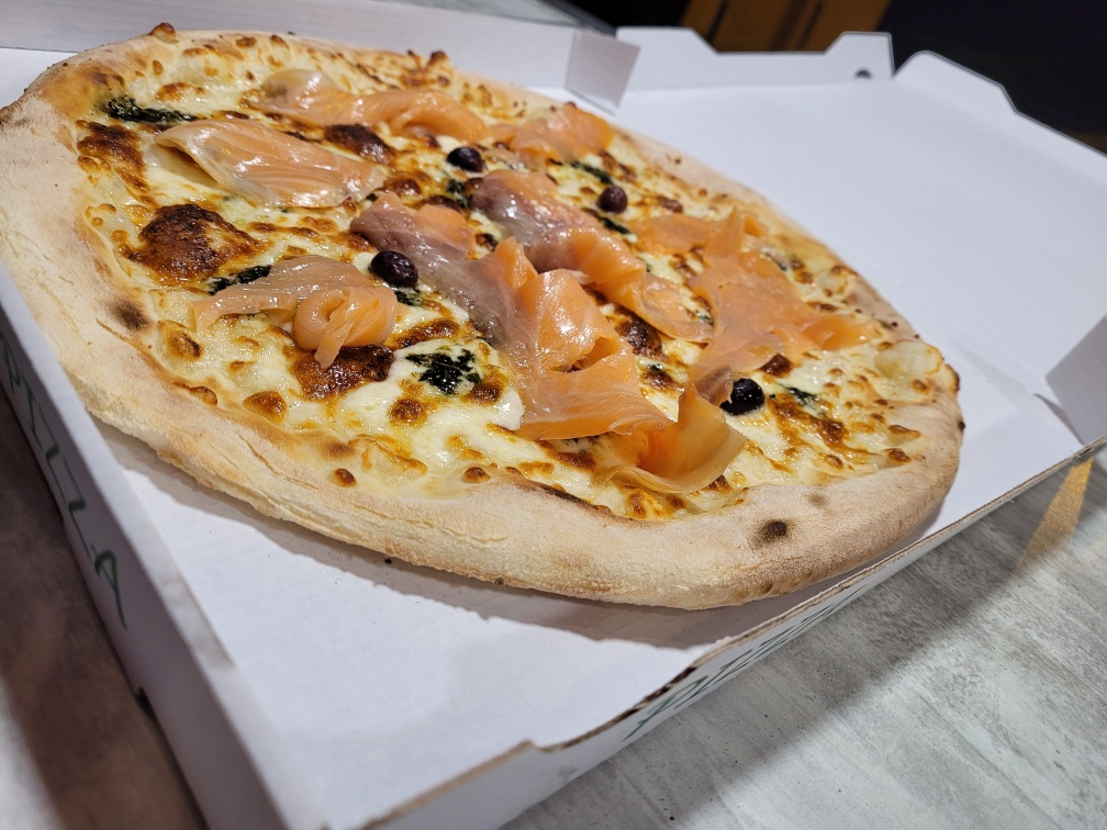 Crème fraîche, mozzarella, saumon fumé, basilic, olives