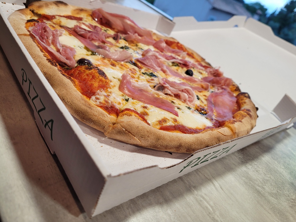 Pâte à pizza rebords fromager, sauce tomate, mozzarella, jambon cru, burrata, basilic