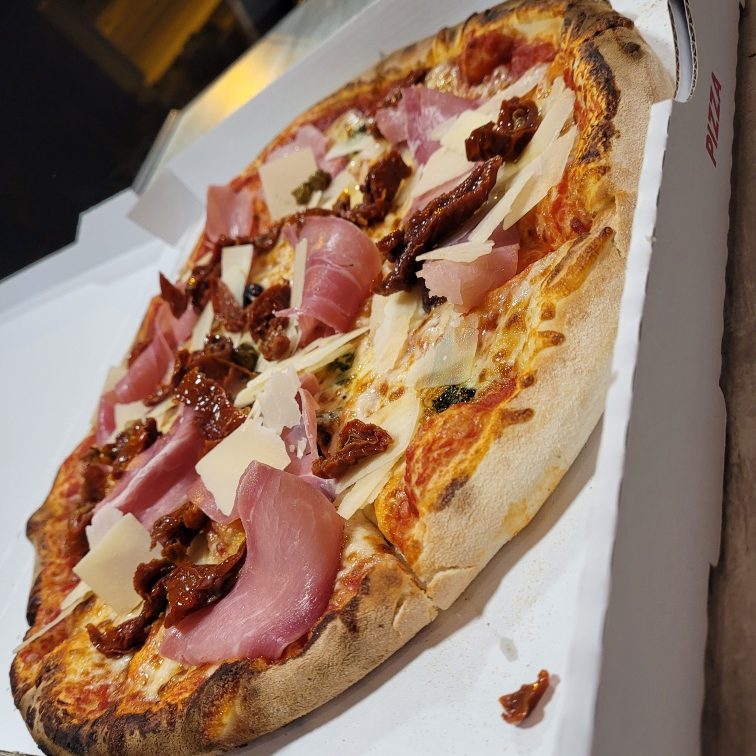 Tomate, mozzarella, jambon cru, tomates séchées, parmesan, basilic, olives