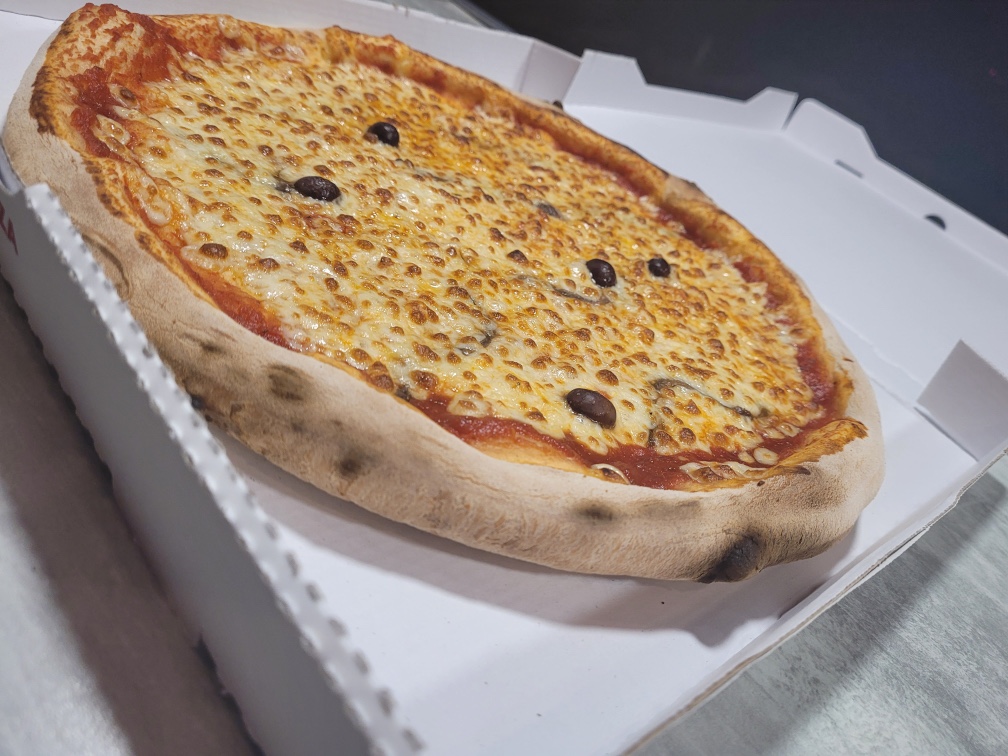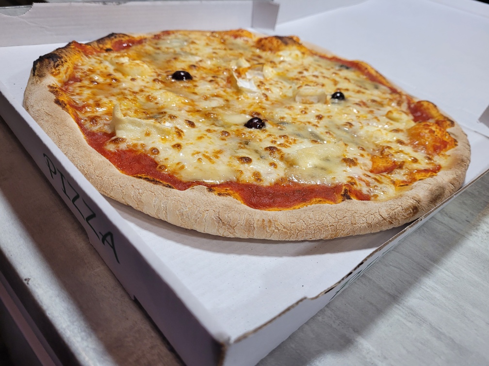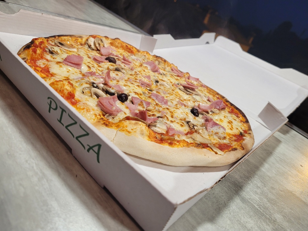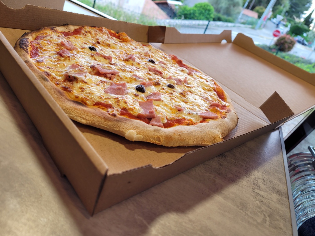 Tomate, mozzarella, jambon, champignon, olives, origan