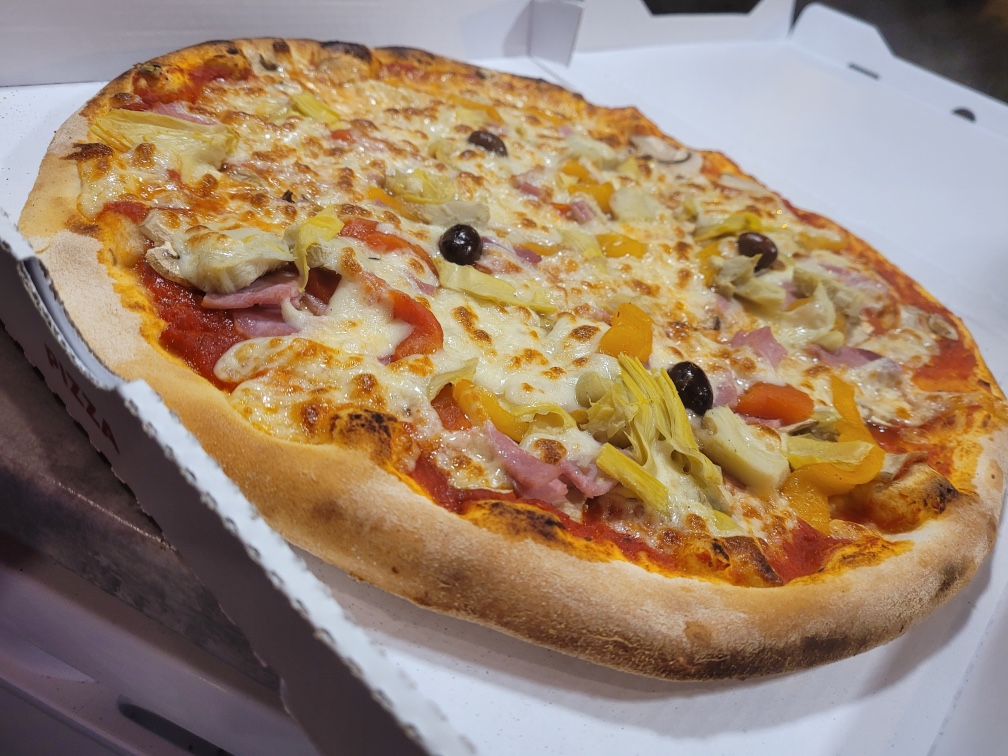 Tomate, mozzarella, jambon, champignons, artichauts, poivrons, olives, origan