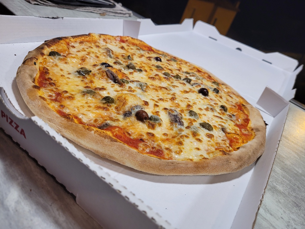 Tomate, mozzarella, anchois, câpre, olives, origan